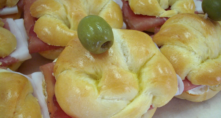 Piccole brioscine farcite con affettati o salmone, boulle (piccoli panini rotondi) all'olio di oliva con salame nostrano, al pomodoro con mozzarella e pomodorini ciliegia, agli spinaci con ricotta e prosciutto cotto, integrali con bresaola e grana.