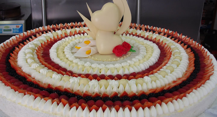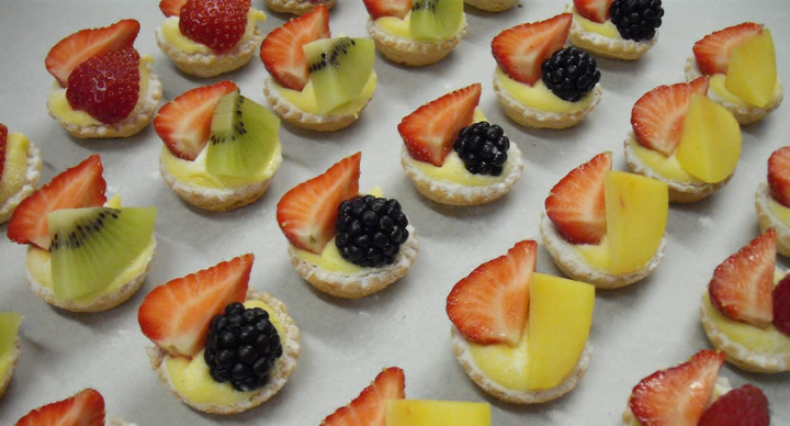Pasticceria mignon, biscotteria e brioches. Buffet, torte e spiedini salati, frutta fresca e altri stuzzichini.